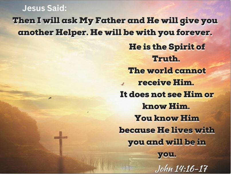15 “If you love Me, keep My commandments. 16 And I will pray the Father, and He will give you another Helper, that He may abide with you forever— 17 the Spirit of truth, whom the world cannot receive, because it neither sees Him nor knows Him; but you know Him, for He dwells with you and will be in you. 18 I will not leave you orphans; I will come to you.