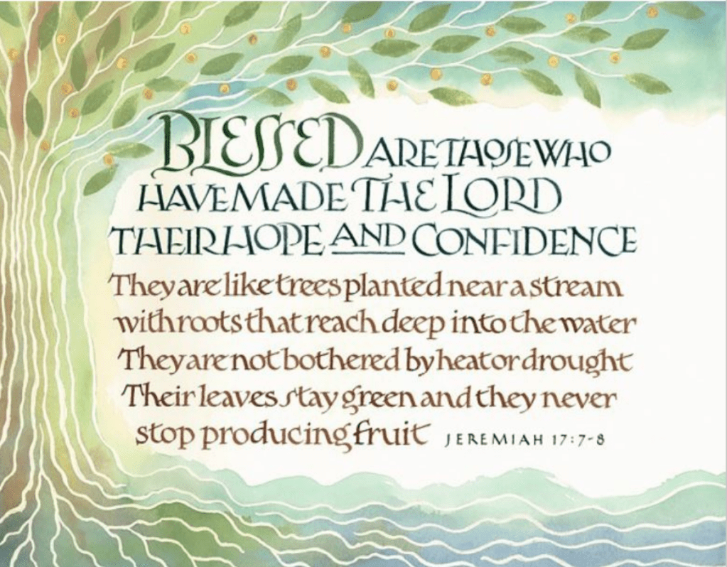 Jeremiah 17 compares those who trust and hope in God to trees planted by a river, receiving fresh life and nourishment from the Spirit.
