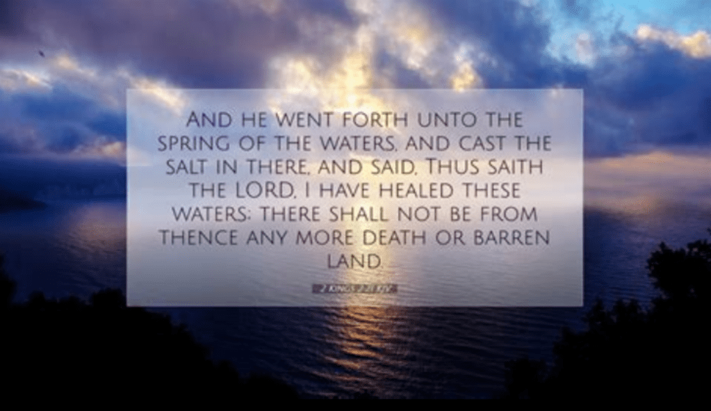 20 And he said, “Bring me a new bowl, and put salt in it.” So they brought it to him. 21 Then he went out to the source of the water, and cast in the salt there, and said, “Thus says the Lord: ‘I have healed this water; from it there shall be no more death or barrenness.’ ” 22 So the water remains healed to this day, according to the word of Elisha which he spoke.